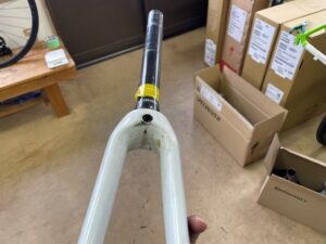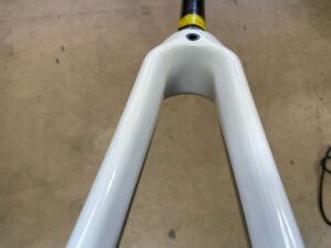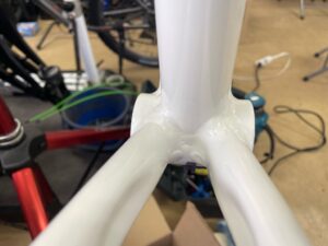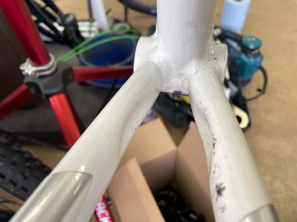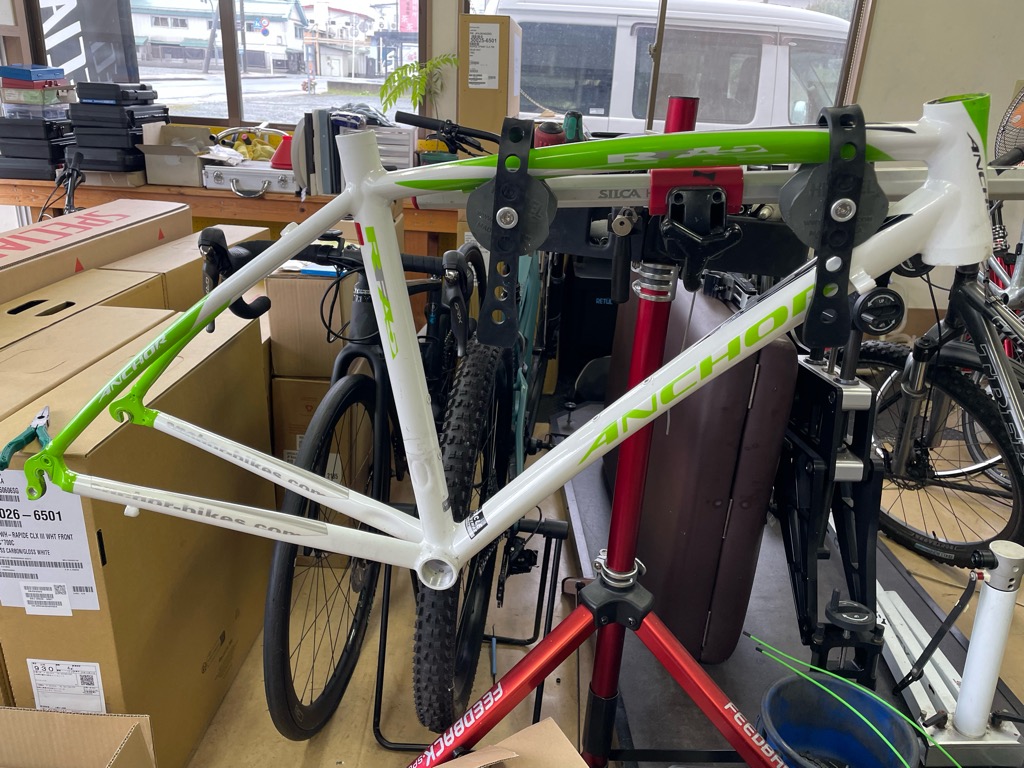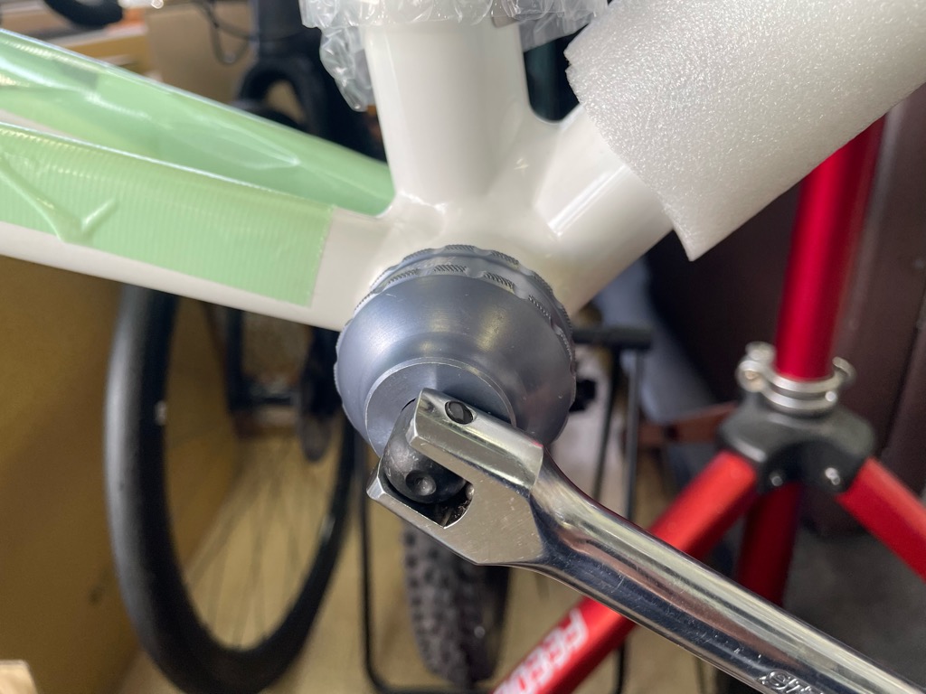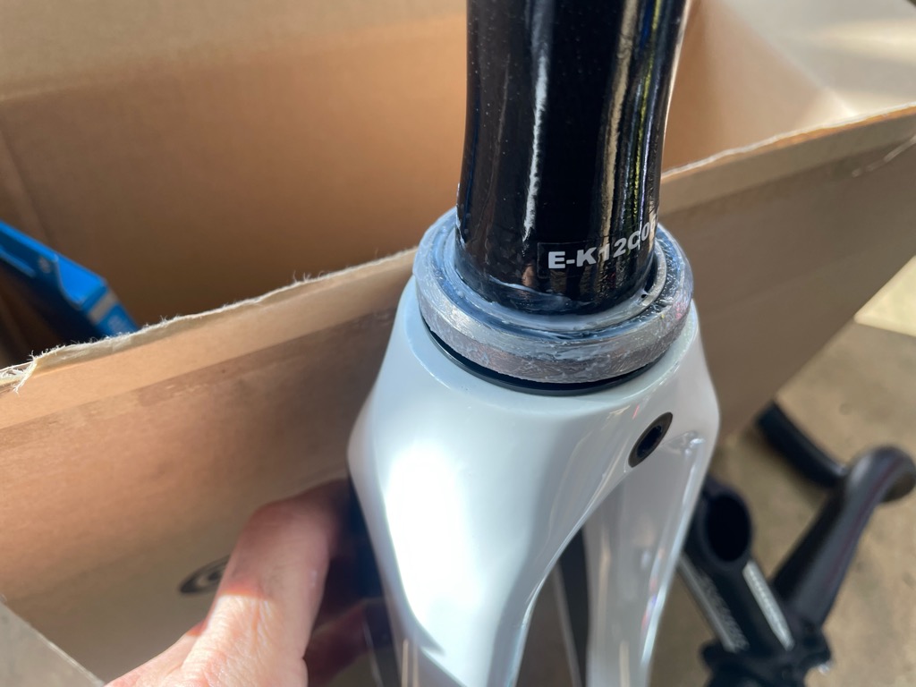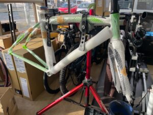 フォーク、ステム、ハンドルバーを組み付けたところで、フレームとフォークを養生していきます。