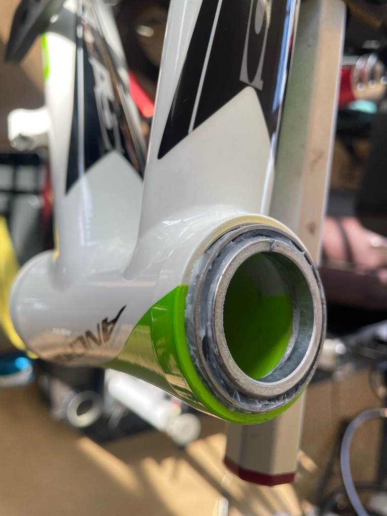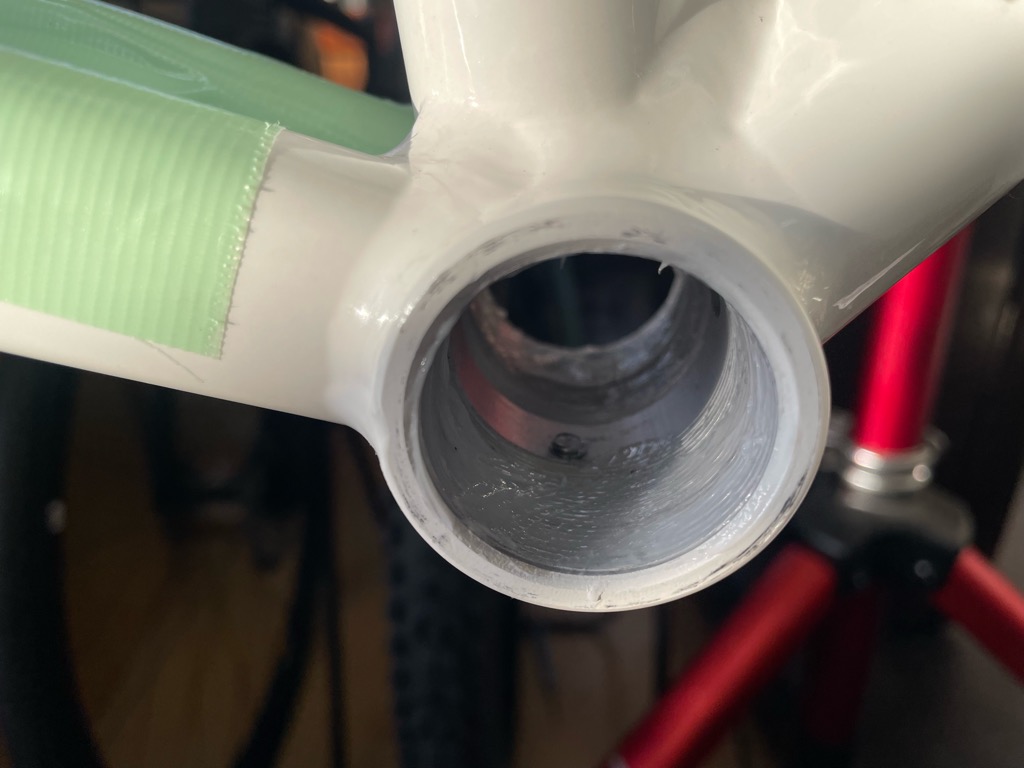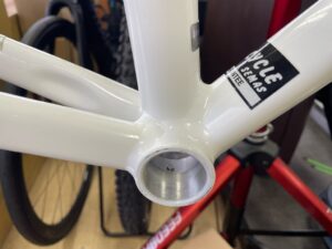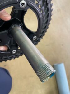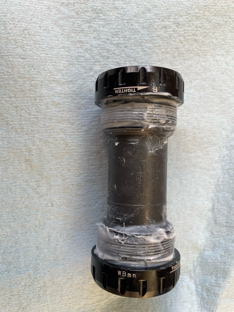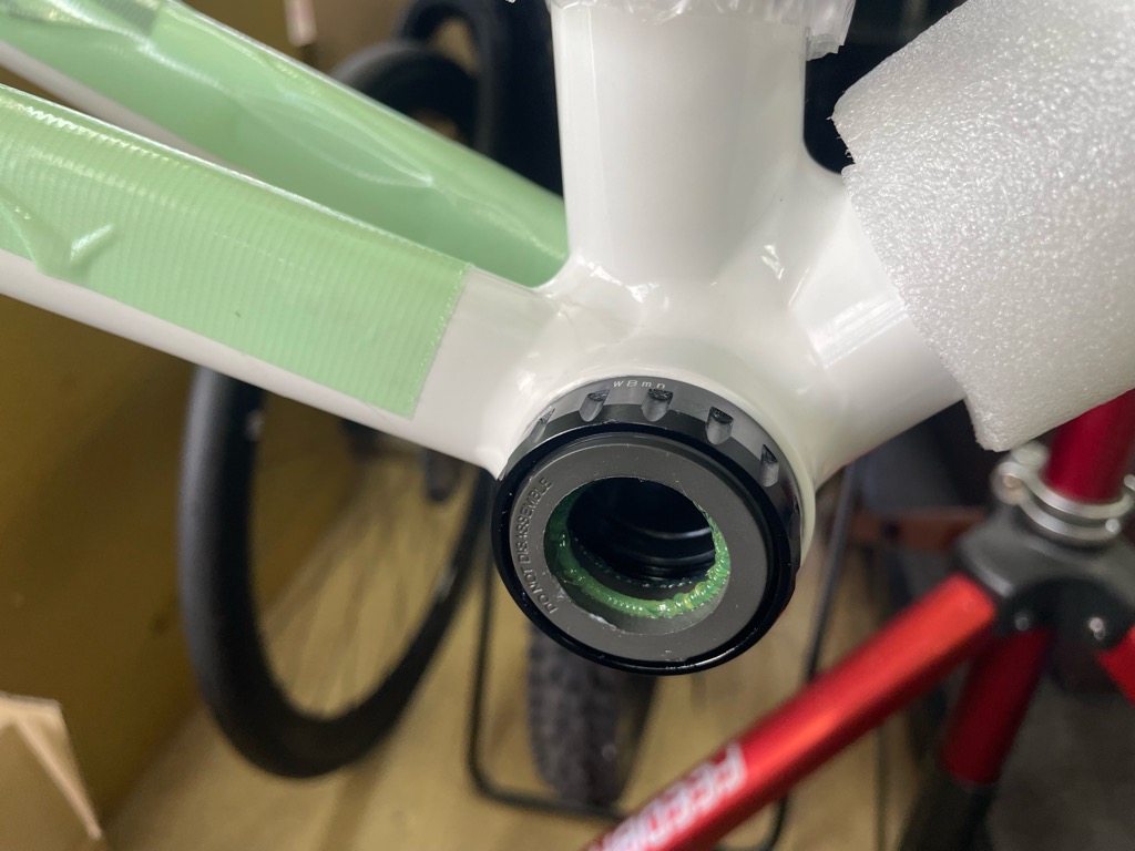 BBにも耐久性の高いグリスをたっぷり、フレームにも塗布して組み付けます。
