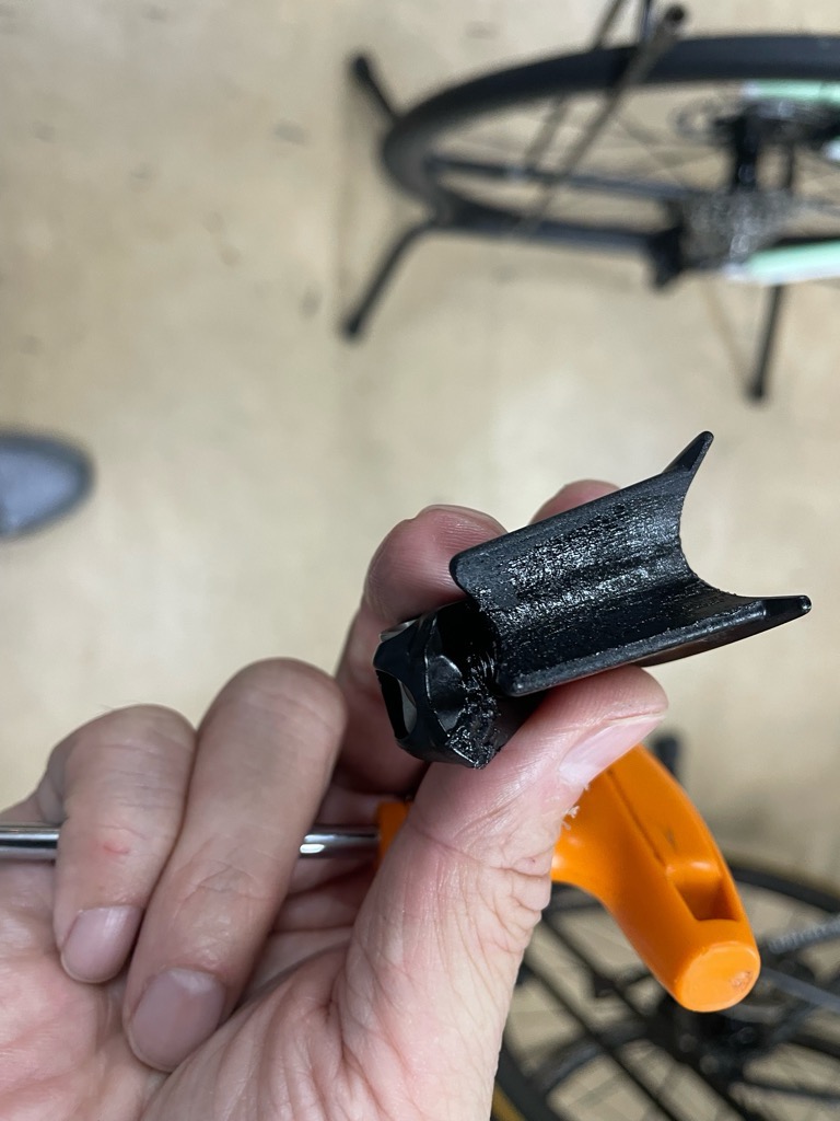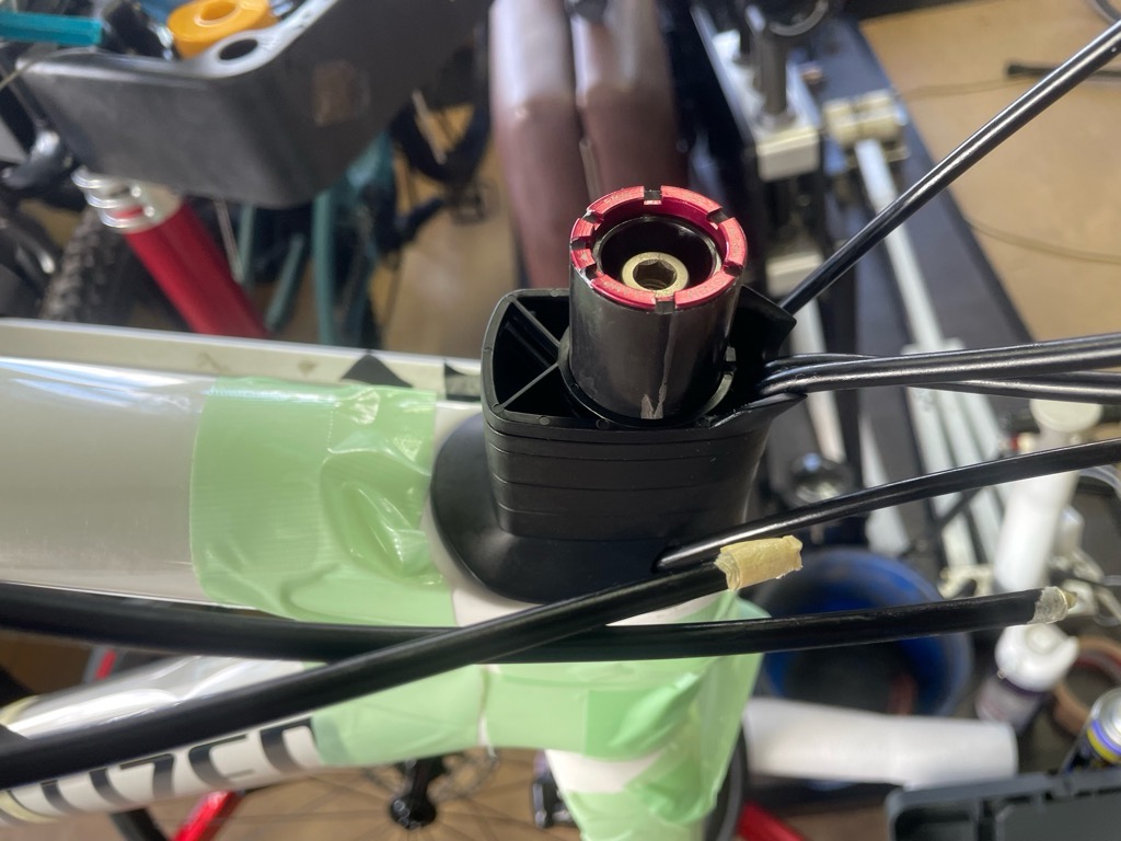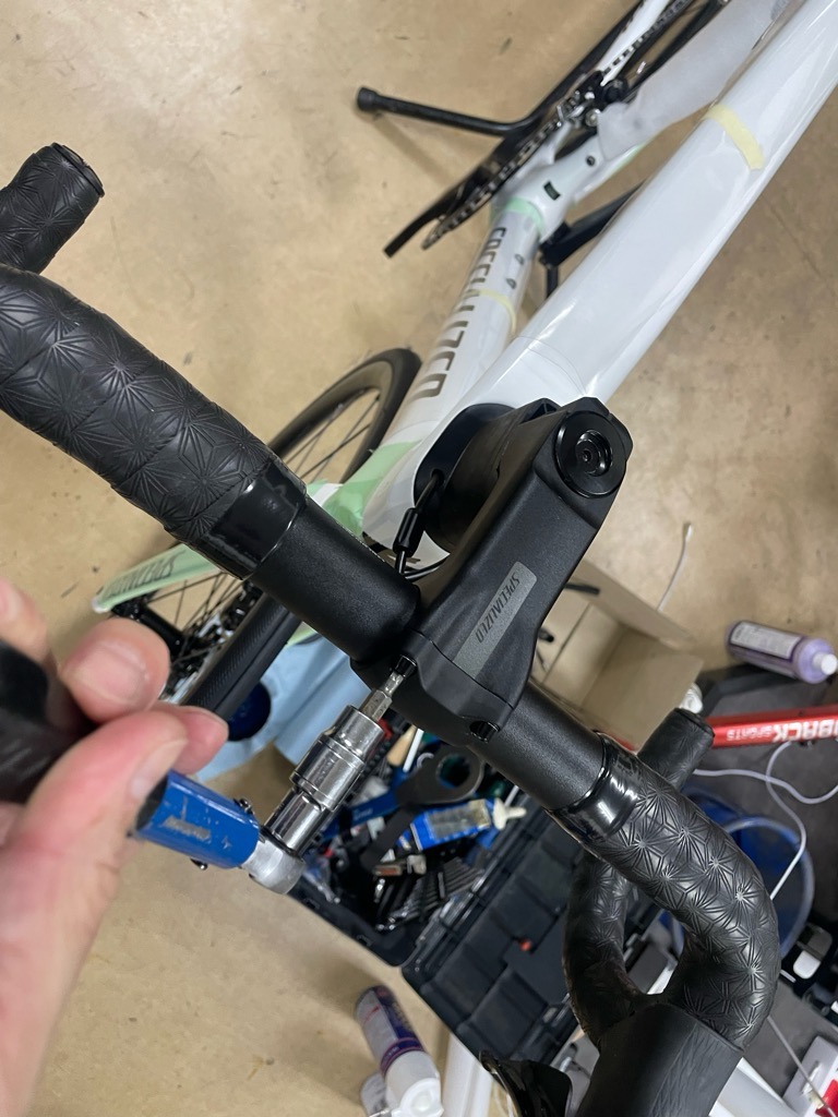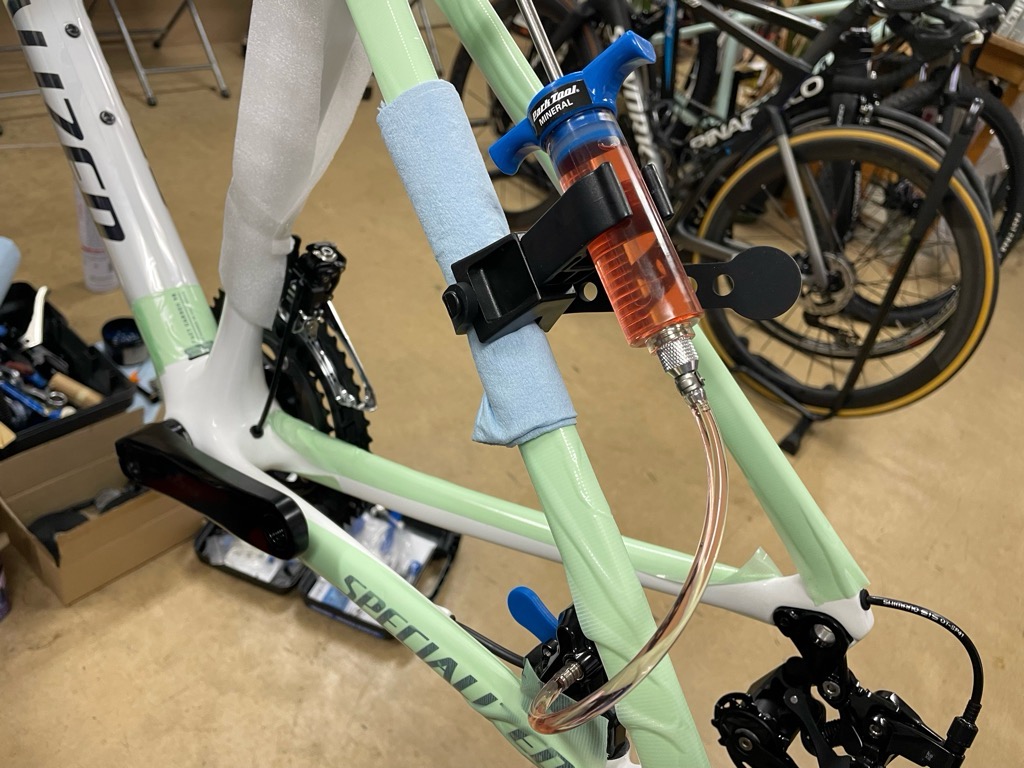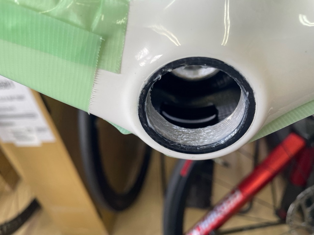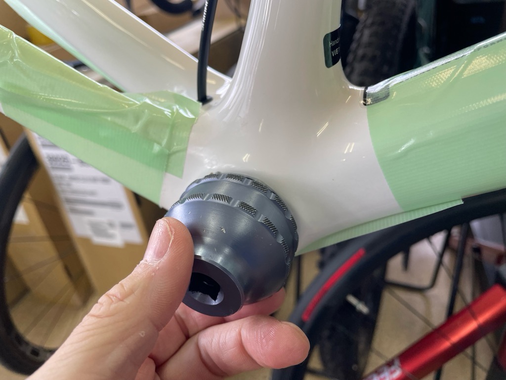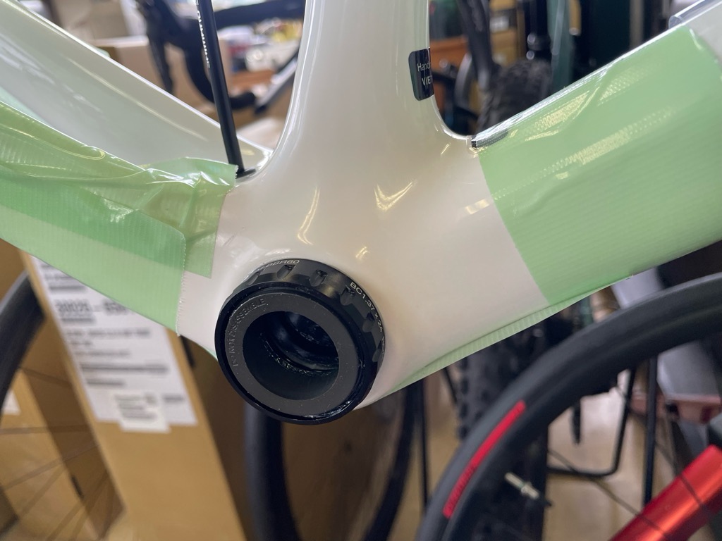 スペシャライズドのフレームはねじ切りの精度も良いのである程度ツール手回しでほぼ入っていきます。最後にレバーでトルクをかけて締め付けます。