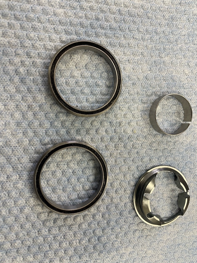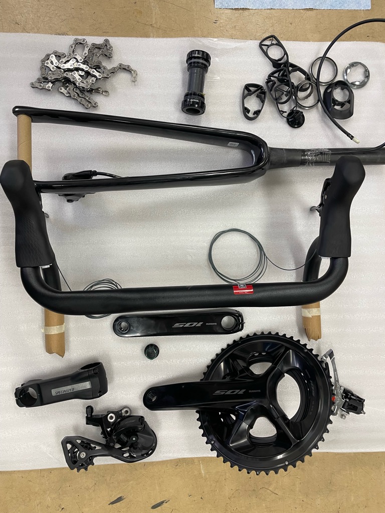 クランク、BB、ヘッドセットなど外した部品を並べてみました。
