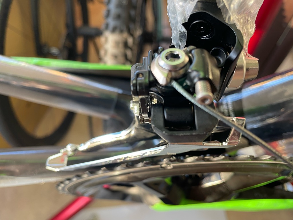 クランク、フロントディレイラー、クランクなどのパーツを取り付けしていきます。