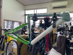 作業中、うっかり傷をつけてしまわないようにフレーム全体を養生していきます。