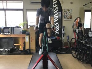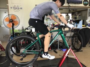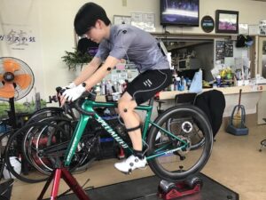 身体測定で身体の状態。脚長差や柔軟性、筋肉のつきかたを確認してからバイク上でのフィッティングに移ります。