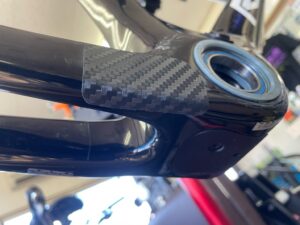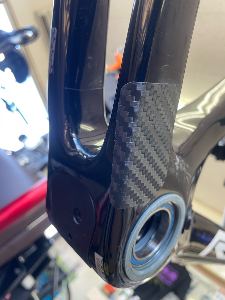 フレームの洗浄後、チェーン落ちによる傷にカーボン(調)シートを貼ります。