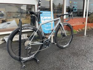 以前ご紹介した入荷フレーム、S-WORKS AETHOS2で店頭試乗車を組みました。