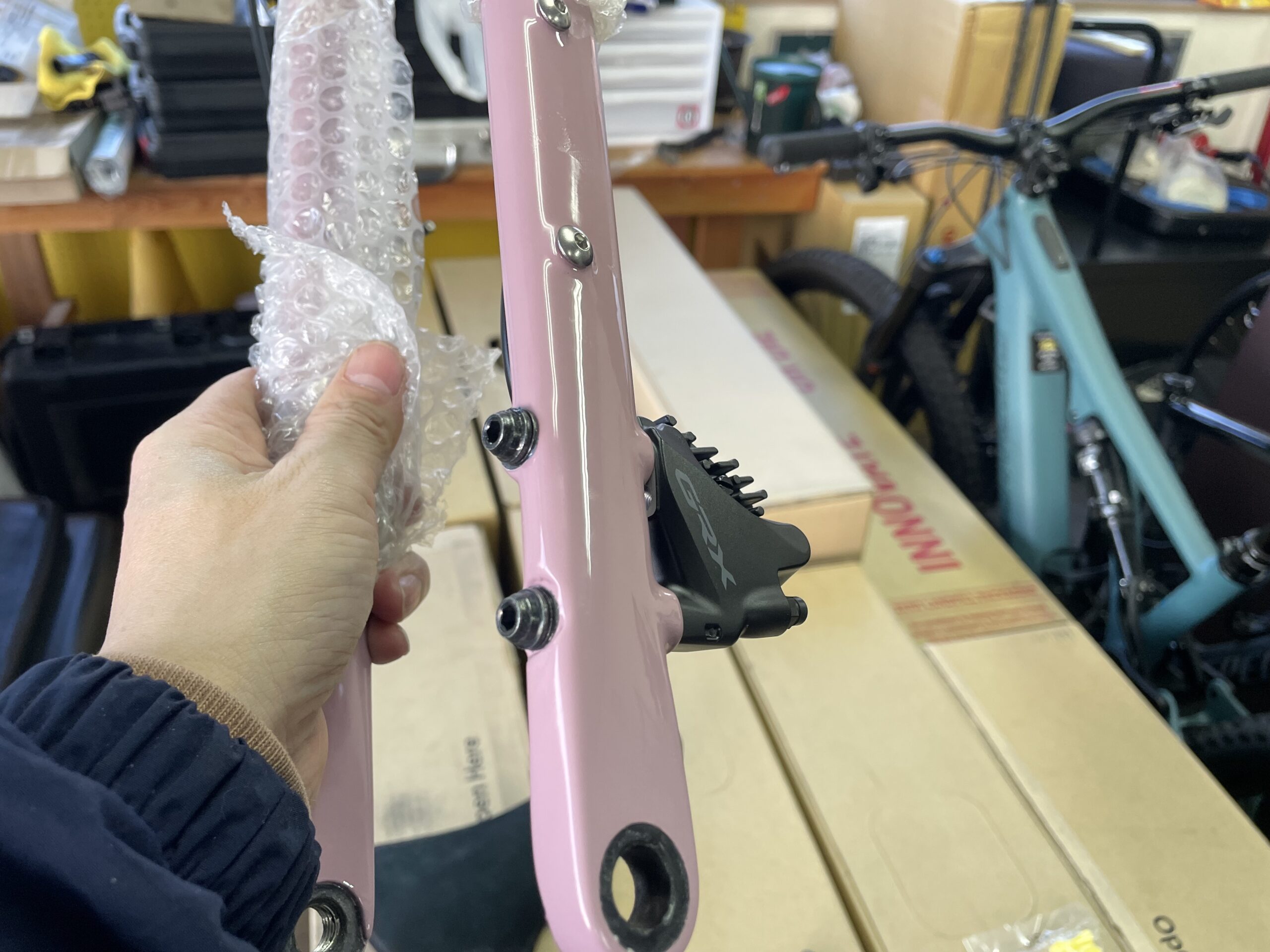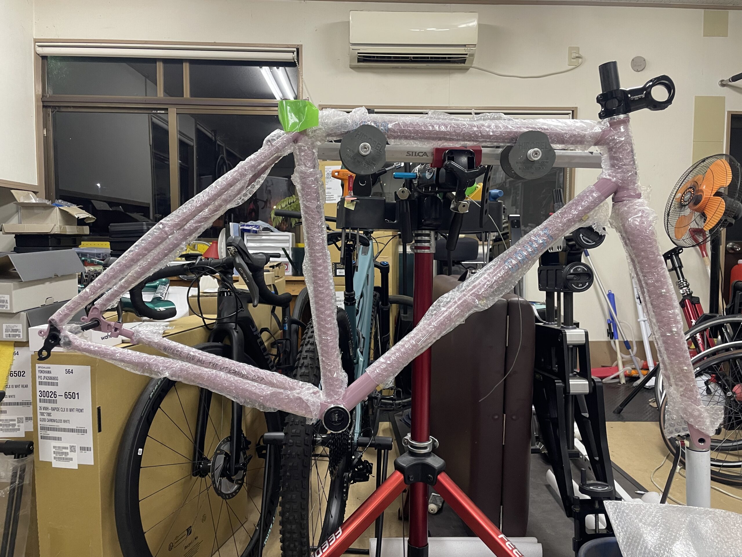 組み立てはショップにお願いした方が安心だからと、お住まいの県のスポーツサイクル店を中心に何軒か問い合わせたもののすべて断られたそうで、最後に当店に行き当たったとのこと。