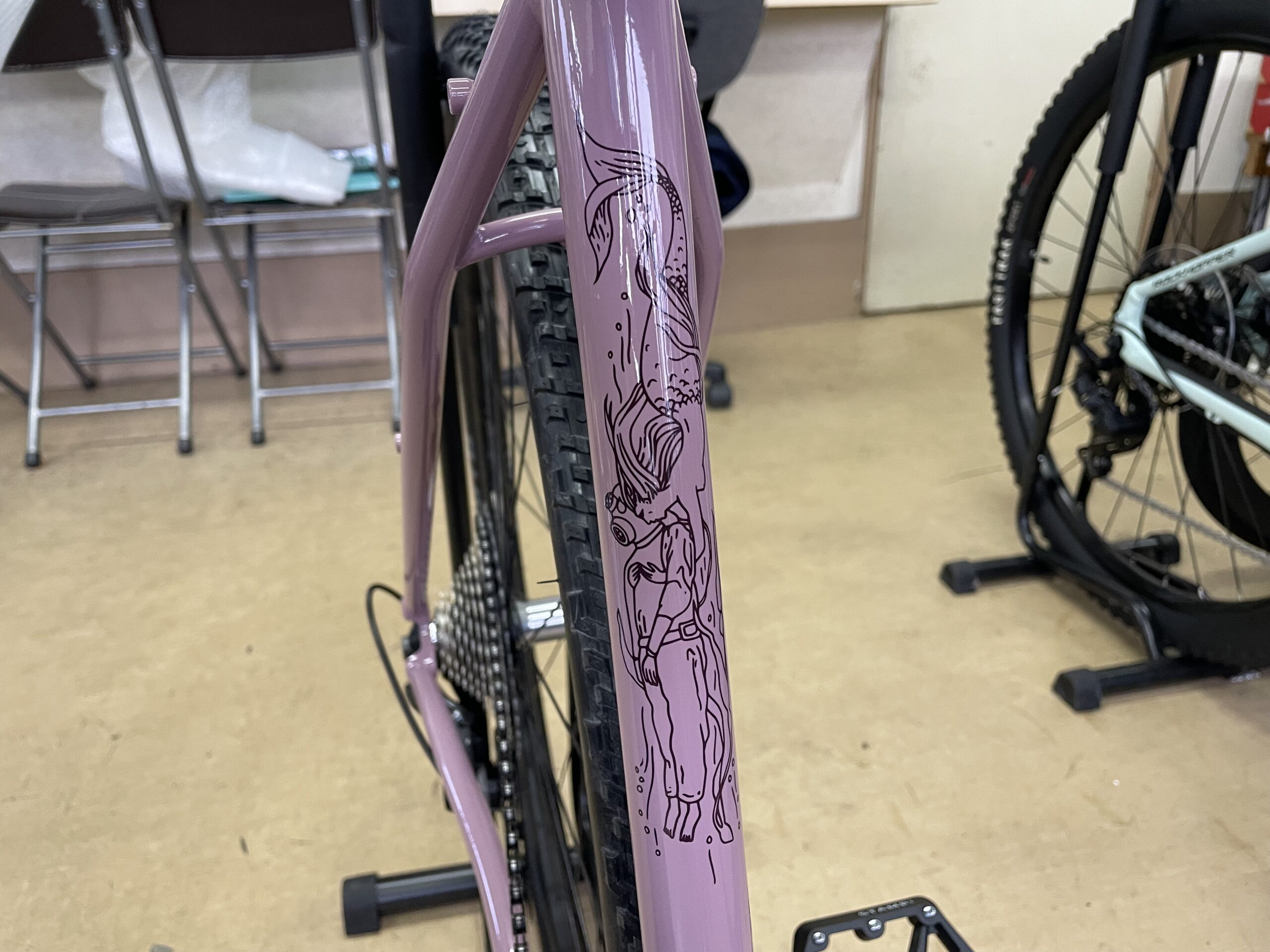 クロモリならば塗装面には尚更気をつけて作業します。ミイラパッケージ。